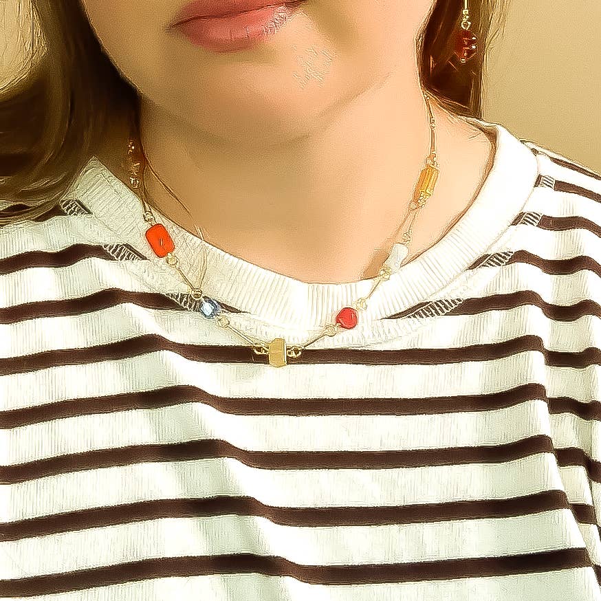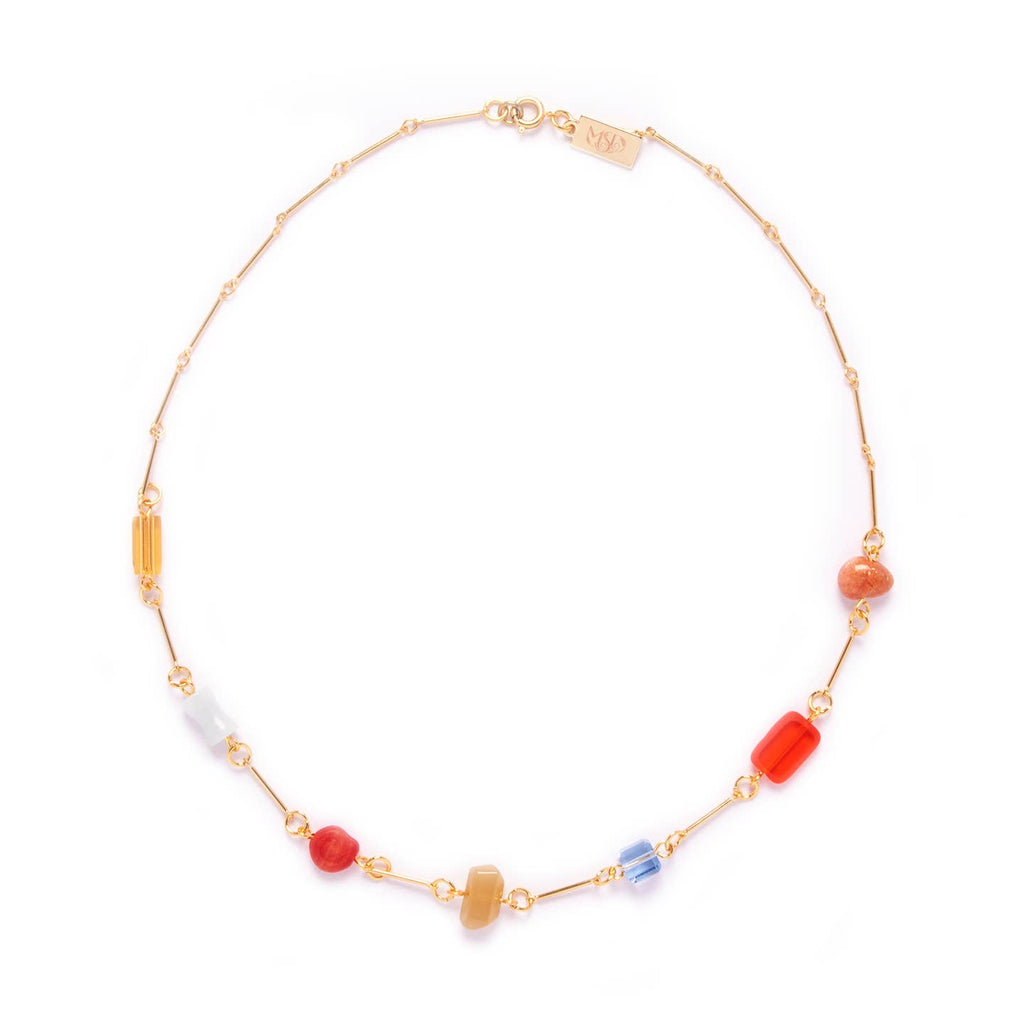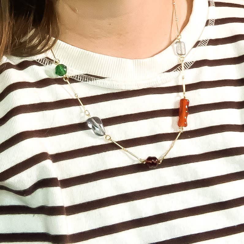 Composition Necklace Michelle Starbuck Designs $62.00 Style No. 1 No. 2 No. 1 No. 2 Add to Cart This item is a recurring or deferred purchase. By continuing, I agree to the cancellation policy and authorize you to charge my payment method at the prices, frequency and dates listed on this page until my order is fulfilled or I cancel, if permitted. Please fill in the form below if you'd like to be notified when it becomes available. Your Email Send This site is protected by hCaptcha and the hCaptcha Privacy Policy and Terms of Service apply. Vintage glass and agate beads on a gold plated brass bar chain. No.1 - 18" gold plated chain No.2 - 17" gold plated chainHandmade in Chicago