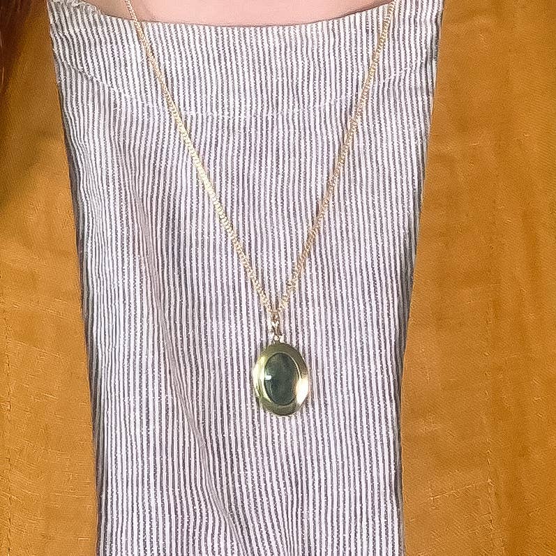 Oval locket pendant in polished brass with a Wyoming jade flat top cabochon.
