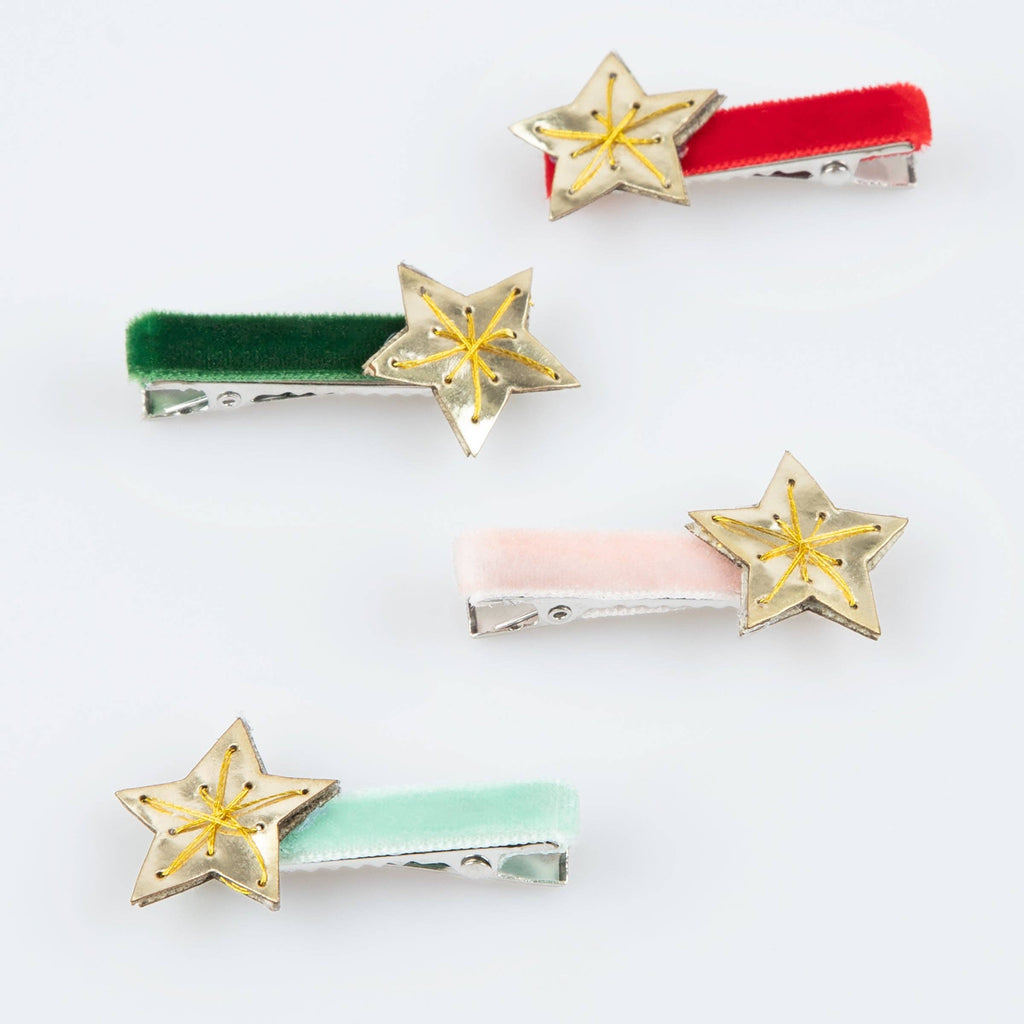 8 hair clips, each with a different colored velvet ribbon - red, dusty pink, mint, bright green, deep red, peach pink, dark green and blue. Each hair clip has a gold star, crafted from matte gold faux leather with gold embroidery thread on the front of each star and crocodile clips in a gold tone.