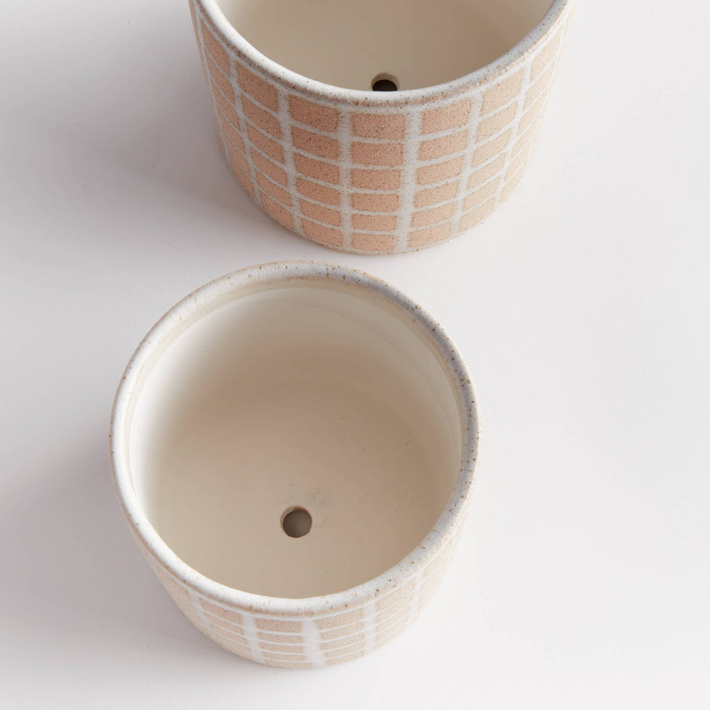 The hand painted grid pattern in a soothing white on taupe gives these pots a graphic, fun look. Add your favorite blooms or lush greens to enhance any contemporary space.