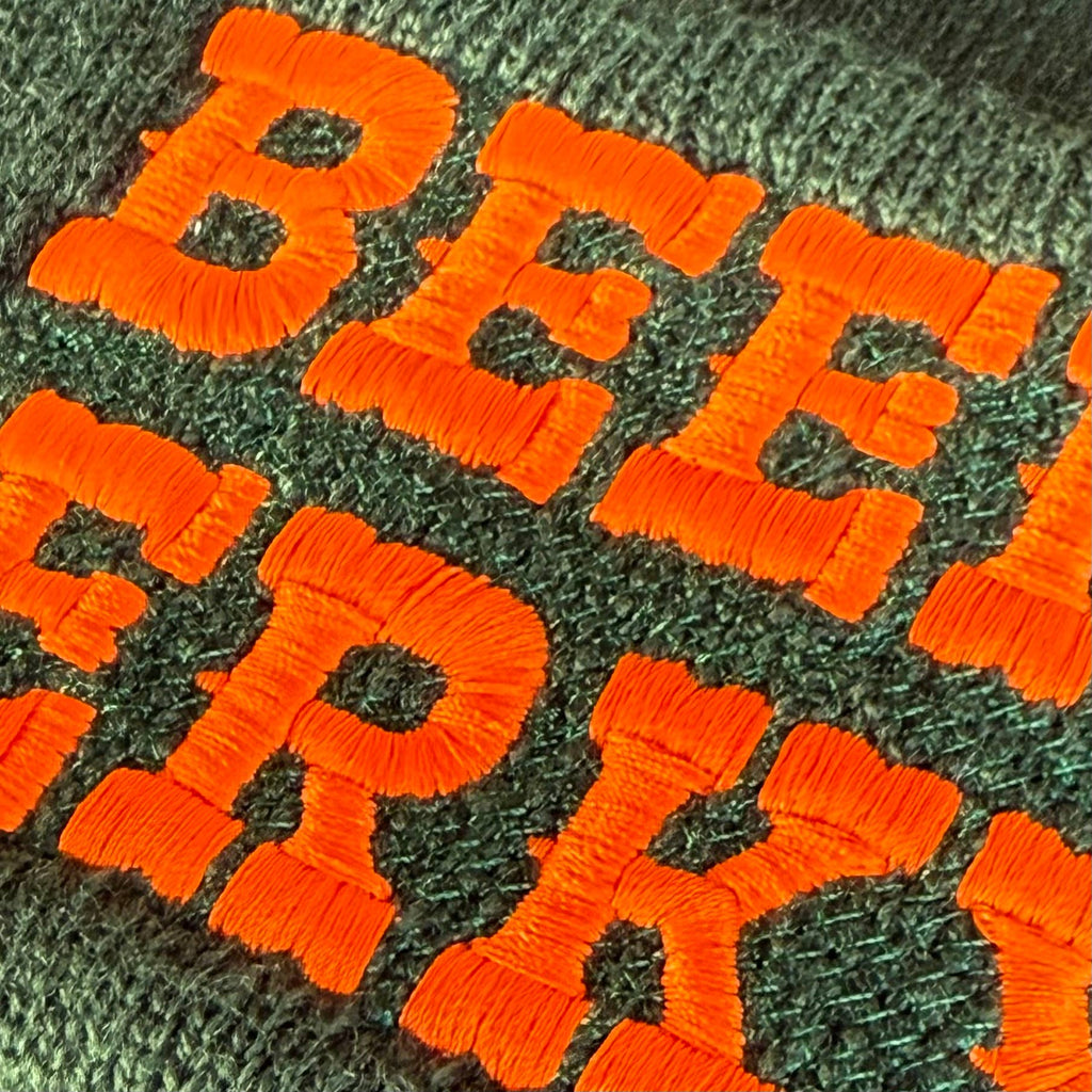 Dark green with neon orange embroidery BEEF JERKY knit beanie