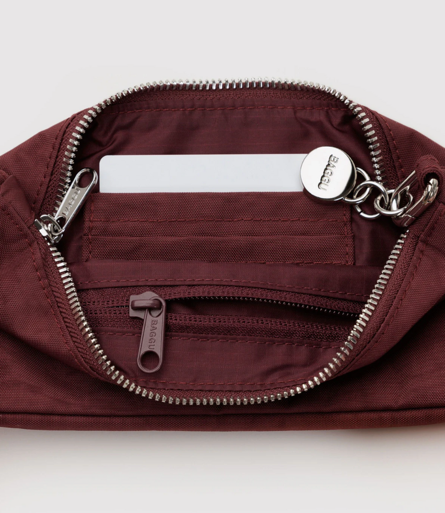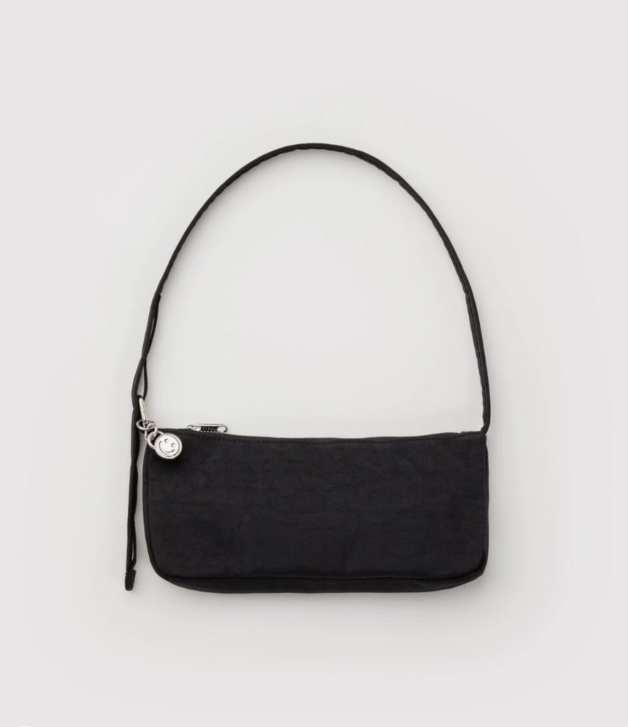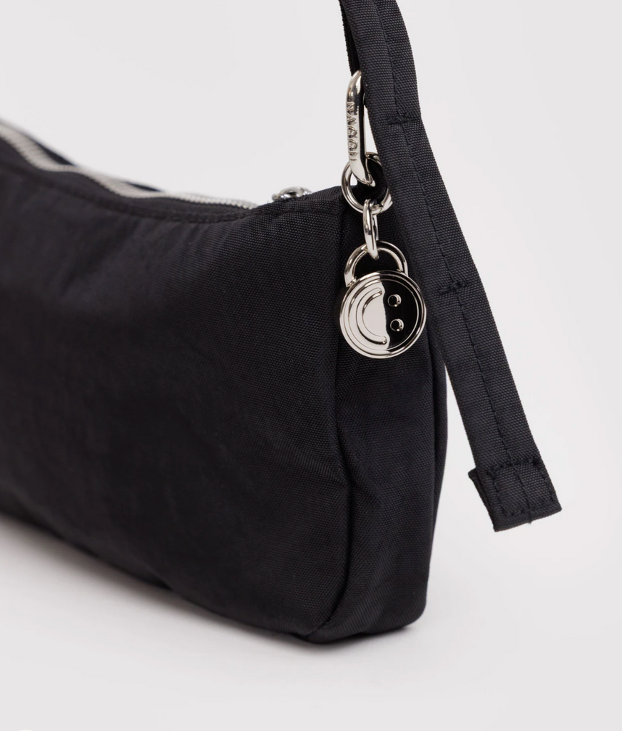A sleek, compact bag featuring built-in card slots for organization, metal charm, and adjustable strap.
